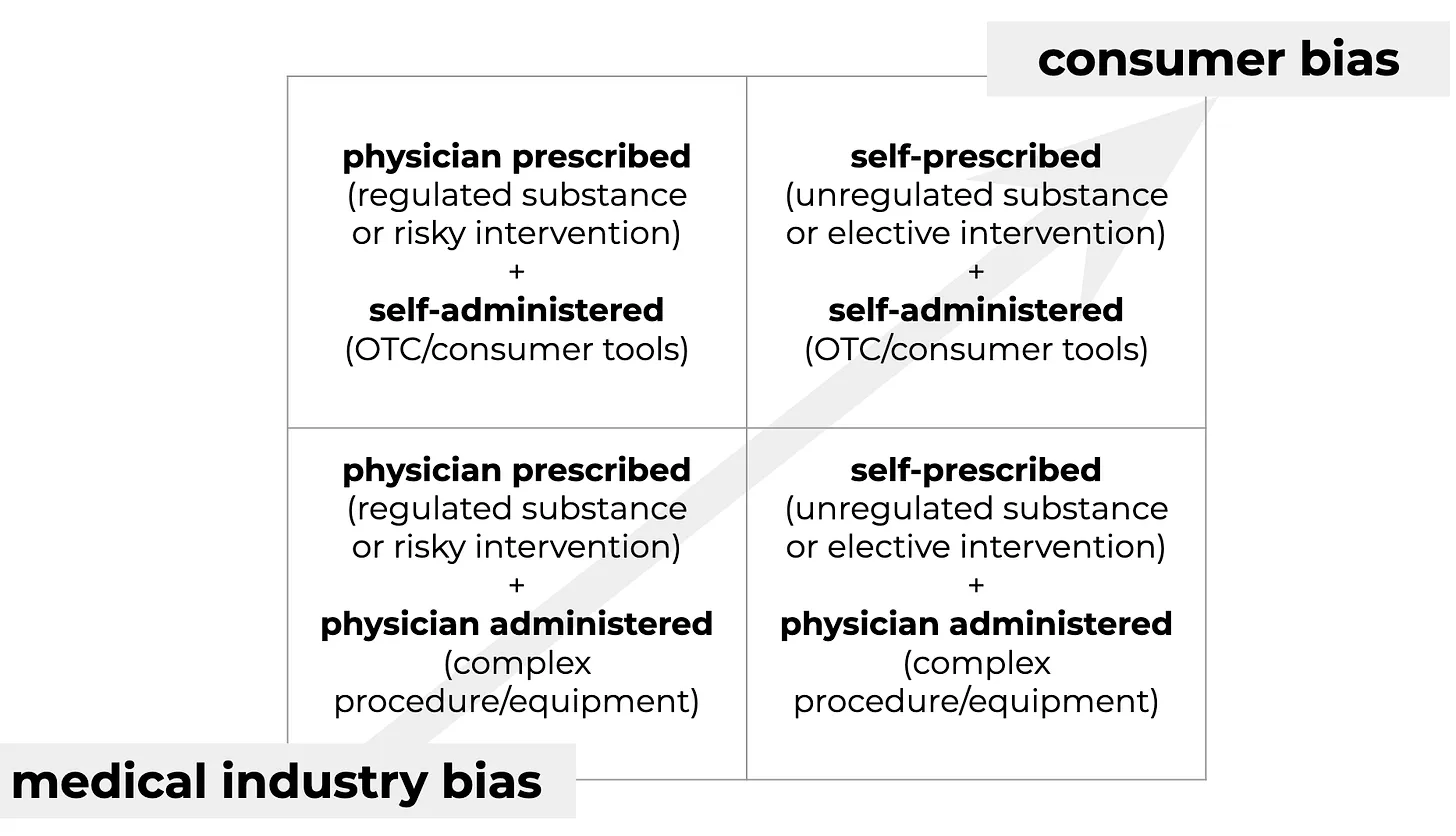 The most immediate promise for everyone to benefit from longevity interventions - both those available now and those on the horizon - may rest with the upper right quadrant: self-prescribed + self-administered. No delays associated with gaming the approvals process by introducing a disease angle, and a real possibility of tapping a larger market: peak biological health is attained roughly in our early 20s, so maintaining that biostatus means ideally starting LIs in early adulthood or midlife.