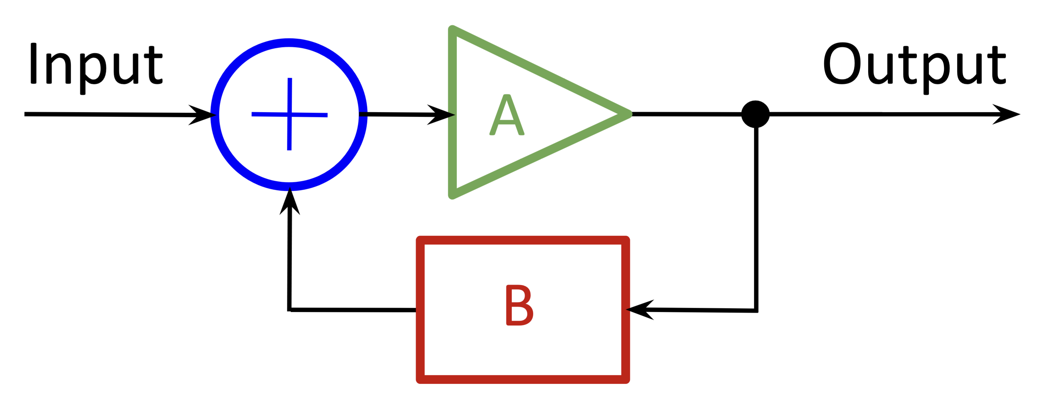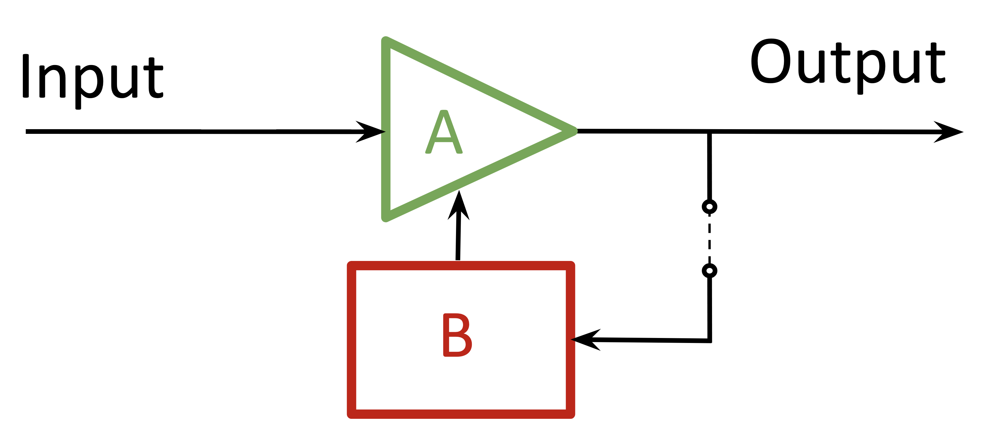 In the schematic, $A$ represents the transfer function of the circuit, and $B$ represents the feedback that tunes circuit behavior.