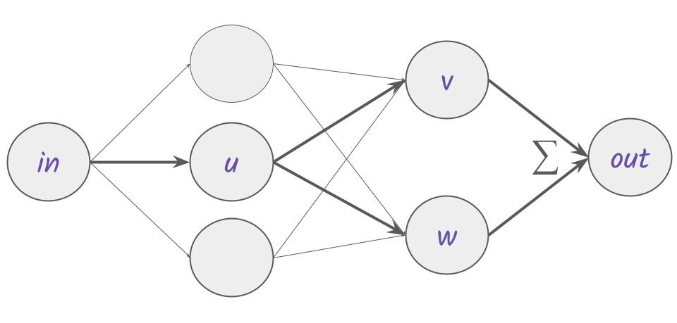 To compute the update for $u$, we’ll only need the gradients between $out$ and $u$. The partials represent local steepness so are scaled by a global step size12, $step$. Finally, summing over all paths that include $u$, we evaluate the total update for $u$: