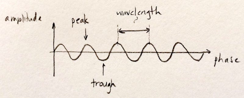 Picture some gentle water waves in the ocean. So soothing. Or, picture some monster waves you’re dying to shred. Take your pick. Either way, like water waves, the physics-y waves in medical imaging have an amplitude (height of the peak of the wave) and phase (the part of the wave you’re at: the peak, the trough, or somewhere in between). Importantly, they also have a length: the distance from one peak to the next. (It wouldn’t be a wave if it didn’t repeat that way and have a more-or-less constant peak-to-peak distance.) Since we’re talking about a wave, that length is called a wavelength.